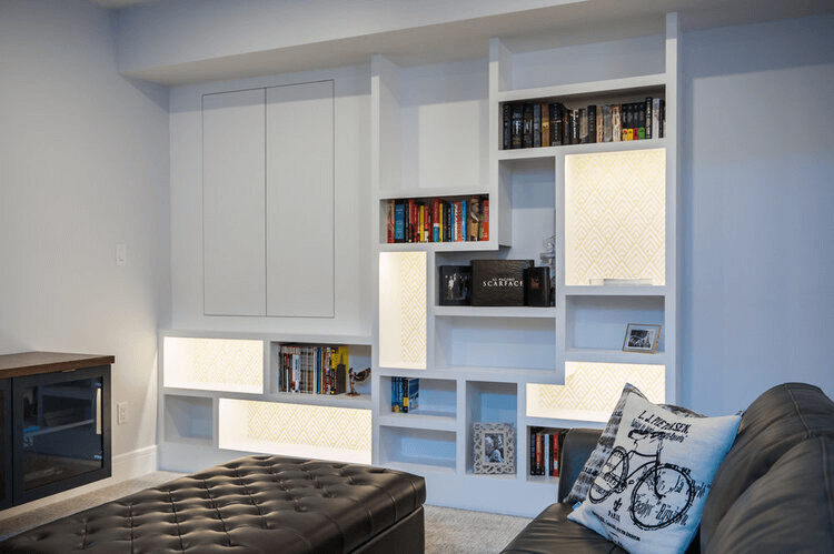 Storage is another key consideration in basement design. Built-in cabinetry and shelving help maximize square footage while keeping the space organized and free of clutter. Custom solutions can be tailored to fit your needs, from creating hidden storage to displaying artwork or books.